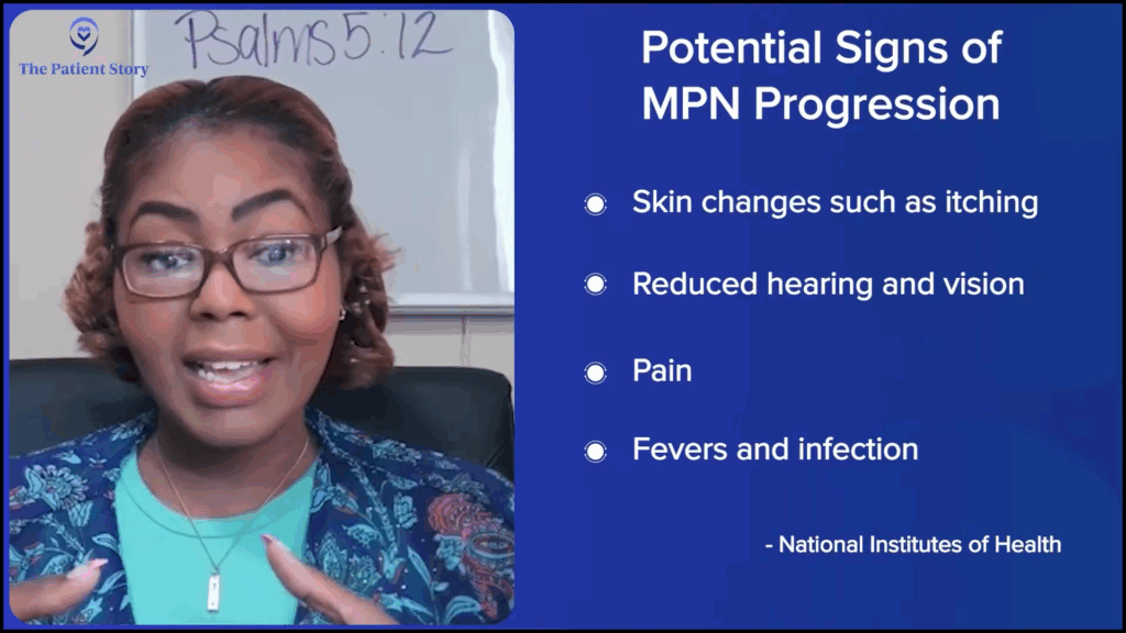 Ruth: Now, let’s talk about progression. It’s a topic nobody wants to face. Or maybe we all want to talk about it, but we don’t want to go there. We know MPNs can progress over time — for example, ET to PV, or for me, PV to MF, and MF can progress to acute myeloid leukemia (AML). That can bring up a lot of emotions, stress, and sleepless nights.