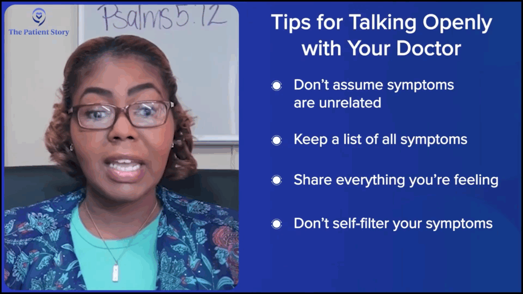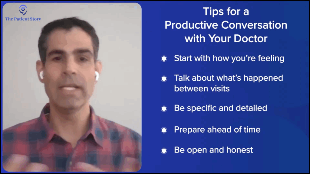 Ruth: Tracking your symptoms and bringing that information to your health team can make a big difference. What tips do you have for talking openly, honestly, and clearly with your doctor and your entire care team about how you’re feeling? Do you have any specific tips? What helps you maintain an open conversation with your care team?