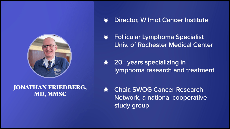 Joining us is a true titan in the field: Dr. Jonathan Friedberg. As the director of the Wilmot Cancer Institute, Dr. Friedberg has spent over 20 years at the forefront of lymphoma research and treatment. What makes him the perfect guest is his balanced philosophy of care. He is an expert in the most advanced therapies and a leading voice for active surveillance.
