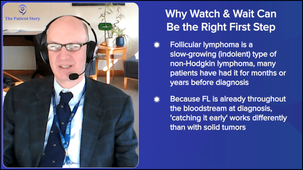 Since follicular lymphoma is a blood cancer, it’s in many places at diagnosis. There isn’t a concern about spreading. It’s already in many, many places. We know from decades of natural history studies that this disease can grow very, very slowly. I tell patients that they’ve probably had it for months to years before meeting me, without realizing it.