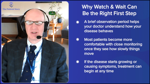 Nicky: Let’s jump right into it. When a patient is newly diagnosed and told, “You need to go watch and wait,” the anxiety about not treating the disease can be debilitating. How have you dealt with that with your patients?