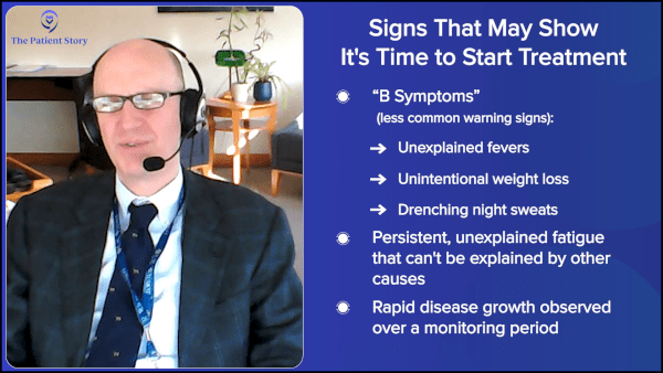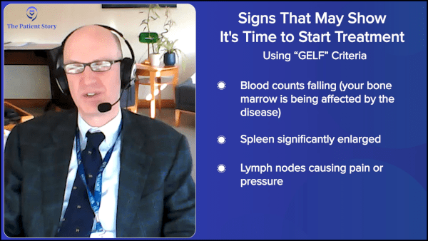 It includes blood counts. If normal blood counts start to get low because of the disease, that’s an indication for treatment. If the spleen gets very enlarged or lymph nodes are of a certain size, which may cause discomfort or other problems, those would be indications as well.