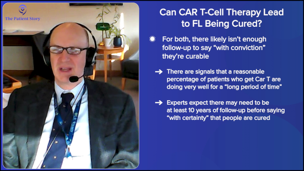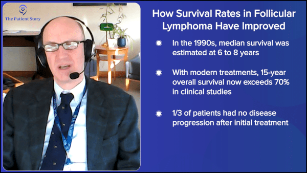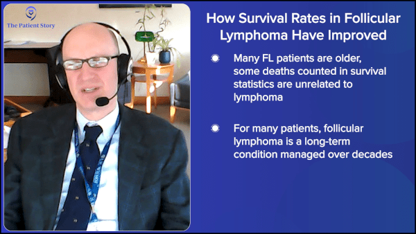 Many patients with follicular lymphoma are older and may be dying of other causes, so the overall survival statistic includes deaths from other causes. It suggests that for a large number of FL patients, mortality from lymphoma is truly not going to be the issue.