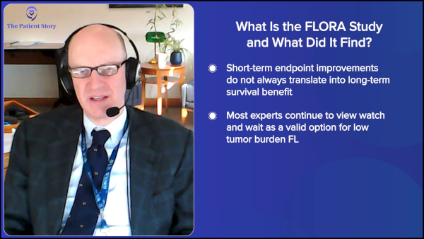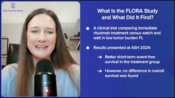 Nicky: I’m an administrator of a large Facebook group called Living with Follicular Lymphoma, and in the last 12 months, there has been a lot of discussion about whether watch and wait is still a viable option. I believe this has come out of a study presented at the 2024 ASH meeting, the FLORA study. It looked at whether watch and wait was better than immediate rituximab monotherapy in patients with very low tumor burden. The findings were interesting. The study was actually terminated early because results were so clear that event-free survival was significantly better in the treatment group. But it’s not really all as it seems, is it?