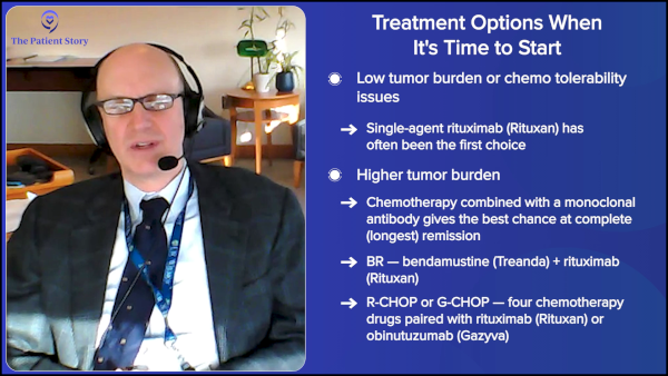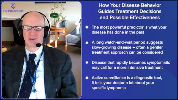 You can use the same principle upfront. The median time on watch and wait in most trials or experiences has been in the 2-to-3-year range. If you’re observed and go eight years before needing any treatment, that’s a sign the disease is growing very slowly, so you’d probably choose something relatively gentle, like single-agent rituximab.