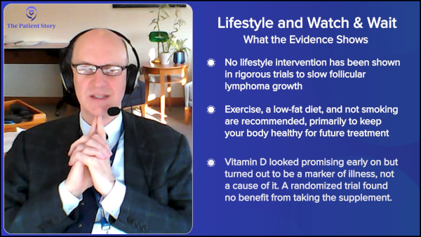 My advice is: Although we don’t have anything that specifically impacts follicular lymphoma, this is an opportunity to think about a healthy lifestyle to protect your heart and lungs, and to prevent other medical problems, so that if we ever need to treat the follicular lymphoma, you’re going to be healthy. Avoid smoking, exercise, and eat a low-fat diet. Even if there’s no impact on follicular lymphoma specifically, protecting your heart means all treatment options remain available to you when you need them.