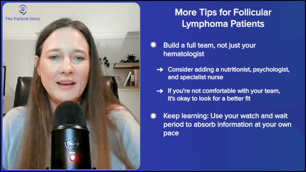 I’m a follicular lymphoma patient myself. I was diagnosed in 2014 and was immediately put into treatment. At the time, I was extremely grateful to be doing something about it. But as I’m experiencing my first relapse, I’m on watch and wait or as many like to call it, active surveillance, and I cannot tell you how grateful I am for that.