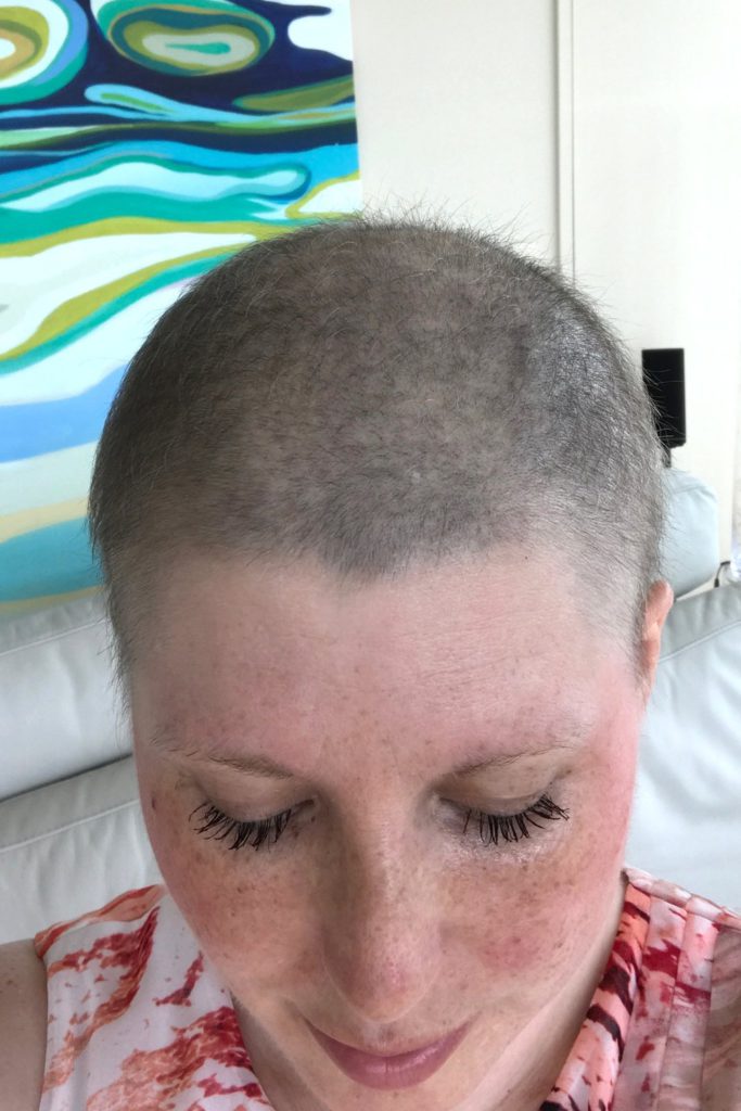 Lo combatí. Pero cada vez que tocas tu cabello te das cuenta que lo pierdes más rápidamente, y es horrible. Así que contacté a mi estilista y le dije que iba a venir y que tenía dos misiones. Primero, que había que cortar todo el resto de cabello que me quedaba.